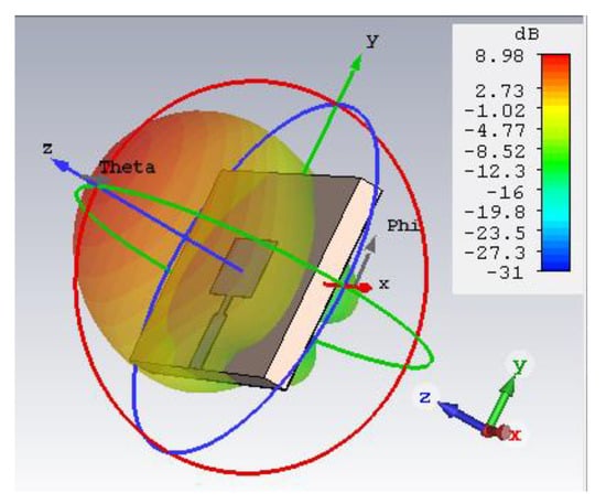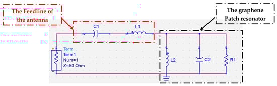 The desired current distribution specifies the optimum position for the excitation process so, the proposed structure of the single-element antenna is shown in Figure 3. The calculated value of the circuit parameters is listed in Table 1. Figure 4 shows the circuit model connection diagram of the proposed antenna. The results obtained from the HFSS and ADS circuit theory approach are in good agreement with those obtained using CST software. The |S11| curve of the graphene plasmonic antenna is illustrated in Figure 5. There is a small deviation in the |S11| curves, which may be due to the different numerical approaches used in different software. The 3D radiation pattern of the proposed graphene plasmonic antenna is depicted in Figure 6. Figure 7 shows the graphene’s frequency-reconfigurable behavior of the graphene plasmonic antenna when the chemical potential applied varied between 0.5 and 2.5 eV. This figure reveals that the plasmonic resonance frequency of the proposed antenna increases via the chemical potential and can be dynamically controlled in a wide frequency range from 2.75 to 4 THz. So, this design has dynamic reconfigurability by applying an external electric field.
