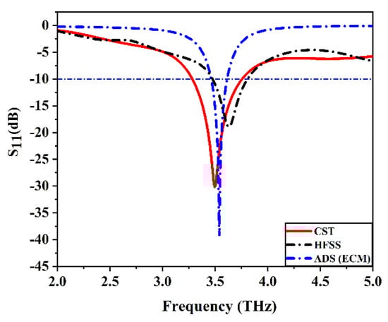 |S11| of the single element graphene plasmonic patch antenna with different simulation programs.