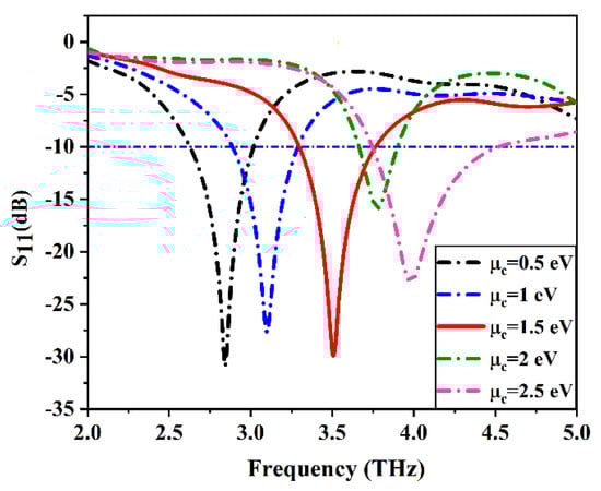|S11| parameters of the graphene plasmonic antenna for different chemical potential.