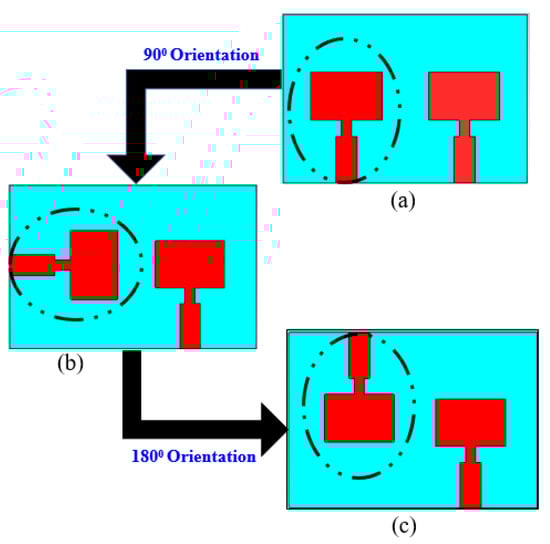 The proposed three different MIMO antenna configurations (a) 0° orientation, (b) 90° orientation, (c) 180°orientation.