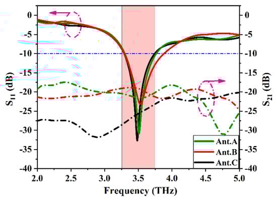 The MIMO system’s advantage is that it provides data rate augmentation even in the presence of signal fading, multipath fading, and interference. The MIMO system was designed to meet the requirements of acceptable MIMO parameters because of the need to transmit more data over greater distances. Mutual coupling between elements in a MIMO array could alter the performance of a single-element antenna. The distance between the MIMO units regulates this mutual coupling, which is formed via electromagnetic interaction between them. The optimum separation distance between adjacent MIMO elements is the system’s most important goal. An antenna with a large distance between elements ensures non-correlation but increases the overall antenna size, whereas a small distance will increase the mutual coupling between the elements. So, mutual coupling is an important parameter that should be studied that faces the MIMO antenna systems. The two-element graphene plasmonic microstrip MIMO patch antennas are illustrated in the following part. In order to create the optimal MIMO antenna configuration, it is necessary to first determine the orientation of the optimal elements to achieve the desired high level of isolation. Figure 8 demonstrates the proposed three configurations that are used in the antenna design. The first configuration (Ant. A) is shown in Figure 8a the two elements have a 0° orientation side by side with the first element. The second configuration (Ant. B) is shown in Figure 8b where the two elements are orthogonally oriented with a 90° between them. In the last configuration (Ant. C), the two elements have a 180° orientation as shown in Figure 8c. The simulated reflection coefficients |S11| and transmission coefficients |S21| versus frequency of the three MIMO configurations are investigated in Figure 9. The transmission coefficients |S21| are an important parameter while designing the MIMO system. It is the measurable parameter of the mutual coupling between the MIMO elements.
