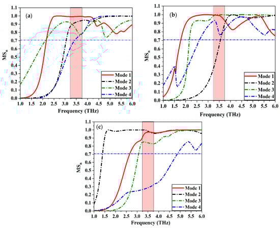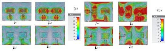 The evaluation of the two-element graphene plasmonic MIMO antenna structure is carried out and optimized using CMA for three different configurations. Firstly, in Ant. A structure, the model significance, and the model current distribution curves at the resonance frequency of 3.5 THz are investigated in Figure 10a and Figure 11a, respectively. The model significance curve indicates the first four modes of operation through the entire band. It can be seen that the four modes play a significant role in the desired bandwidth (), but modes 1 and 2 give a high contribution in the desired bandwidth rather than modes 3 and 4. Moreover, modes 1 and 2, have the highest values (close to unity). So, it is expected that one of these modes is responsible for the antenna resonation at 3.5 THz and the other one is responsible for coupling between the two-elements’ graphene plasmonic MIMO antenna. The model current distribution makes the divergence between the first two modes. From the current distribution depicted in Figure 11a; mode (Jn1) is the dominant mode that is responsible for the antenna resonation and mode (Jn2) causes the coupling between the two-radiating elements of the MIMO antenna because of the high current density between the elements which, in turn, affects the overall antenna performance negatively. Therefore, it is imperative that the characteristics of this mode need to be tuned again with a certain approach. In addition, mode (Jn3) and mode (Jn4) have no impact on the coupling between the MIMO elements. Secondly, in Ant. B, the model significant curve shown in Figure 10b illustrates the first four modes. It can be seen that all modes have the opportunity to contribute to the radiating bandwidth () with different levels of acceptance such as modes 1 and 3, which have the highest values of , while modes 2 and 4, have the lowest one. So, the model significant property is not sufficient to specify all the modes and clarify which of them is responsible for the coupling, non-coupling, and resonance effect. The model current distribution in Figure 11b is a good candidate that is used to illustrate this point. This figure reveals that modes (Jn3) and, (Jn4), have a current null between the antenna elements, and mode (Jn1) is the resonance one while mode (Jn2) is the coupling mode that needs to be characterized and tuned again to reduce the mutual coupling between the graphene plasmonic MIMO antenna elements. Finally, in Ant. C configuration, the model significant curve depicted in Figure 10c demonstrates the first four modes that participate in the desired bandwidth (). It is interesting to note that, modes 1,2, and 3 only contribute to the desired bandwidth of the antenna as they have the highest value of . However, mode 4 can be neglected because of its low value of within interested bandwidth. This result can be assured by introducing the model current distribution in Figure 11c. From this curve, we can overlook mode (Jn3) and (Jn4) as the current density concentration is very weak between the patches. So, mode (Jn1) is the resonance mode, and mode (Jn2) is the coupling one. The model significance and model current distribution curves of the proposed three configurations of the MIMO antenna reveal that the configuration of the designed antenna is responsible for the degree of the coupling between the two elements. The model current distribution indicates that the best configuration is Ant. C which gives a low coupling between the patches and low current density concentration in comparison with Ant. A and Ant. B.