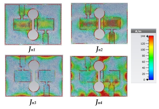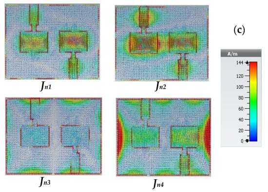 Model current distribution (Jn1–Jn4) of the proposed MIMO configurations (a) Ant. A, (b) Ant. B, and (c) Ant. C.