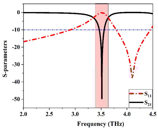 As the distance between the elements of the MIMO antenna is responsible for the mutual coupling issue, the performance of the antenna seriously deteriorates as this distance decreases. The three configurations of the MIMO antenna introduced above suffer from mutual coupling problems, so, a de-coupling structure is needed to overcome this problem. A complimentary new shape of Dumbbell-structure MTM unit cell is etching in the ground plane with a strong band rejection characteristic (Band-stop Filter) illustrated in Figure 12 and its dimensions listed in Table 1. The S-parameter curve depicted in Figure 13 illustrates that the Dumbbell-structure MTM unit cell has a high band-stop characteristic |S21|. The permittivity and permeability of the unit cell in Figure 14a,b reveal that this structure is an MTM unit cell with a negative value if ( and ) in the desired bandwidth. The MTM unit cell of the Dumbbell-structure that is etched in the ground plane will reduce the mutual coupling between the two elements of the graphene MIMO configurations due to its band rejection characteristic at the desired frequency band. As mentioned before, in the proposed three configurations there is only one mode responsible for the coupling between the two elements (mode 2) in all configurations. So, this mode should be returned to improve the isolation. The MTM unit cell is designed to produce a current flow distribution in the opposite direction of the coupling mode current (mode 2). The characteristic mode theory (CMA) has a vital role in illustrating the behavior of the graphene MIMO systems with and without introducing the Dumbbell-structure unit cell by the usage of model significant and model current distribution. The Ant. C is the best choice to invoke the MTM unit cell on its ground plane as it has a good characteristic rather than the other configurations.
