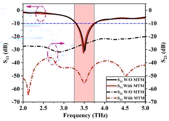 S–Parameters (S11 and S21) of Ant. C with and without the MTM unit cell.