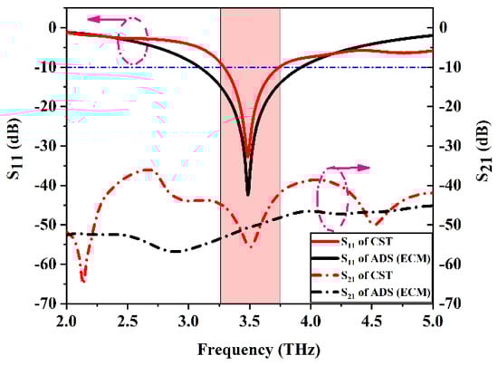 The S–Parameters and the ADS for the equivalent circuit models of the proposed design are listed in Figure 19 and Figure 20 respectively. The isolation coefficient |S21| has been reduced from −25 dB to −55 dB because of the introduction of the Dumbbell-structure MTM unit cell in the ground. The ADS software is used to validate the results by using the equivalent circuit model (ECM) analysis. The ECM consists of a two-input port with 50 Ω input impedance and is separated by the resonator circuit that represents the Dumbbell-structure MTM unit cell. The calculated values of the circuit elements are listed in Table 1. The S–Parameters of the ECM analysis is compared with the CST microwave studio. It can be seen that the ADS results are in good agreement and coincide with the CST result with a little change due to the values of the RLC components.