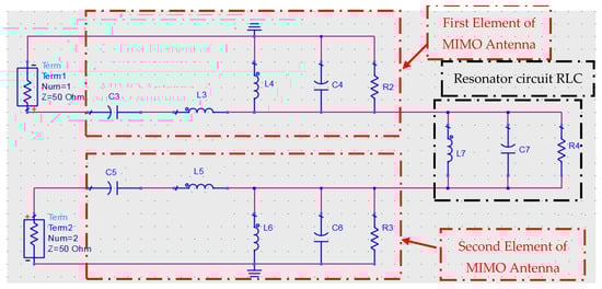 Equivalent circuit model of the proposed structure of two-element MIMO configurations with the MTM unit cell.