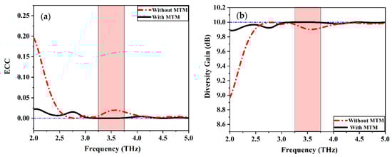 where is the 3D field radiation pattern of the elements associated with the nth port, denotes the Hermitian product operator and represents the solid angle. The evaluation of the ECC using a far-field radiation pattern is a complex method, so the S–Parameters method is very convenient to calculate the ECC between the two antenna elements as it is faster and easy to be used as it depends only on the port parameters of the antenna system. The agreeable limit of the ECC is lower than 0.5. The proposed graphene plasmonic MIMO antenna is simulated and ECC is calculated and displayed in Figure 21a. This figure reveals the comparisons between the MIMO elements with and without introducing the complementary Dumbbell-structure MTM unit cell in the ground plane. The ECC without MTM has a value of 0.0189, while the ECC with MTM is reduced to 0.000168 through the entire bandwidth of operation. The lower value of ECC indicates a lower correlation between antenna elements. This value guarantees good MIMO performance of the proposed antenna. Another way to describe and evaluate the performance of the MIMO antenna structure is the diversity gain (DG), which describes the losses that occur in the transmitted power. The formula given in [39] is used to calculate the DG value: