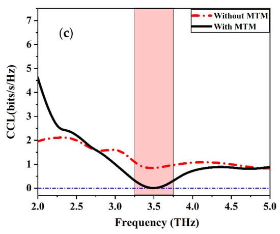 (a) Envelop correlation coefficient (ECC), (b) Diversity gain (DG), and (c) channel capacity loss (CCL) of Ant. C with and without the presence of the MTM unit cell.