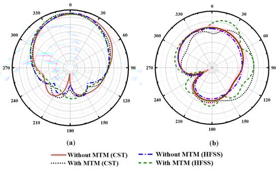 Far-field radiation of Ant. C with and without MTM unit cell (a) E-plane and (b) H-Plane.