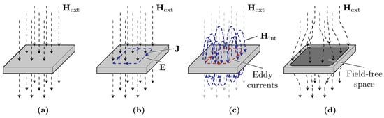 According to Faraday’s law of induction, an alternating magnetic field induces eddy currents into an electrically conductive material (Figure 1a,b). According to Lenz’s law, the magnetic field created by the induced eddy currents counteracts the initial magnetic field (Figure 1c,d). The shielding effectiveness depends on the field properties and the material-specific skin depth :