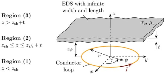 The analytical calculation of the SE in the near-field of WPTSs is based on a methodological approach considering an EDS with infinite lateral dimensions and a conductor loop carrying alternating current (AC) as given in Figure 2. The coil is oriented in a defined distance parallel to the EDS. Depending on the geometry and material properties of the EDS, as well as the frequency and intensity of the initial magnetic field with the magnetic field strength or flux density , a magnetic field with the strength or flux density is shielded by the EDS results. The shielding effectiveness of an EDS is defined as the logarithmic ratio of the shielded to the initial magnetic field [15]: