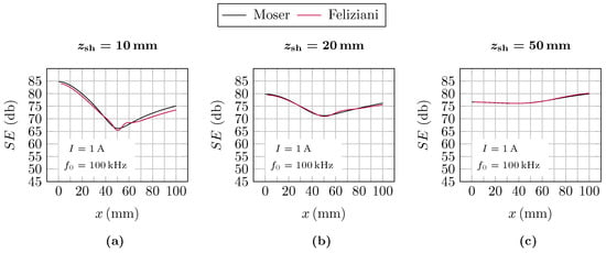 Comparison of the approaches of Moser [16] and Feliziani et al. [17] using the example of a copper plate ( mm, MS/m, ) with the system parameters mm, A and kHz as given in [17]: Shielding effectiveness along the radial distance x at depending on the distance between coil and shield (a) mm, (b) mm and (c) mm.
