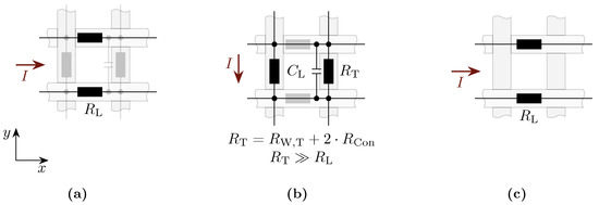 Regardless of the weave, the electrical conductivity of metal meshes differs in longitudinal and transverse directions. In the longitudinal direction, the conduction of the electric current I is described in the direction of the impressed current. In the transverse direction, the electric current I is conducted perpendicular to the impressed current flow. The longitudinal conduction of metallic meshes is characterized by the ohmic wire resistance and the number of wires in the direction of the impressed current (see Figure 5a). The transverse conduction is primarily determined by the specific electrical wire resistance and the number of wires perpendicular to the direction of the impressed current as well as the ohmic resistances of the contacting at the undulation points between warp and weft wire (see Figure 5b). Depending on the mesh size, the resulting capacities must be taken into account. However, in the frequency range of automotive WPTSs, capacitive coupling is negligible. Moreover, it can be assumed that the ohmic contact resistance is significantly higher than the wire resistance . Thus, the longitudinal conduction is dominant under the assumption of identical material-specific electrical conductivities of warp and weft wires. As a result, solely the ohmic wire resistance in the longitudinal direction and the number of wires N are taken into account for the analytical calculation of the anisotropic resistance of metal meshes (see Figure 5c):