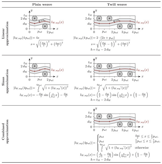 Accordingly, the anisotropic ohmic resistance results from the parallel arrangement of the ohmic wire resistance in the direction of the impressed current flow I taking into account the specific electrical conductivity of the wire material , the wire cross-section and the crimp of the mesh . Under the premise of the given wire material and mesh dimensions, the calculation of the anisotropic volume resistance or specific electrical conductivity of metal meshes results in a function of the wire length , which is independent of the number of undulations considering the repetition of the unit wave cells. Thus, the wire length can be analytically approximated with linear, trigonometric [42] or combined approaches, taking into account pre-stretching in the warp direction due to the extraction of warp wires in weaving processes. Figure 6 summarizes the approaches and formula work for analytically calculating the wire length of meshes with plain and twill weave 2/2 in the warp direction. These approaches are equally applicable to the calculation of the wire length in the weft direction.