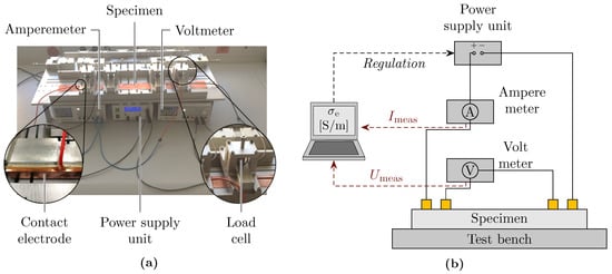 The electrical resistance of metal meshes are to be expected in the m-range. Thus, electrical resistances of metal meshes are to be measured using a four-wire system according to DIN IEC 468 [46]. Therefore, a modification of the test system used in [14] was carried out. The modified test setup enables measurements based on the two-wire system and four-wire system due to modular construction. Figure 7 illustrates the modified experimental setup for determining the electrical conductivity of metal meshes.