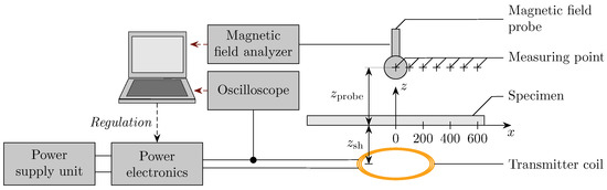 Figure 8 schematically shows the experimental setup for investigating the SE of metal meshes. According to [43], a square test specimen measured to the dimensions of 1000 × 1000 mm is positioned at a defined distance of mm above the transmitting coil. The coil is realized in a circular design with an outer diameter of 500 mm using three turns consisting of two high-frequency (HF) litz wires connected in parallel with a number of 840 wires of 0.1 mm diameter each. To detect the local magnetic field, a spherical magnetic field probe of the type Hioki FT 3470 100 cm2 is located at a defined distance of mm above the test bench carrying the specimen. For lateral positioning, the field probe is mounted on a slide enabling longitudinal movement. In total, seven measuring points are defined along the longitudinal direction at a distance of mm each, with the first point located above the center of the transmitter coil. The current control of the test system is computer-aided via power electronics. The field frequency and the coil current are determined via an oscilloscope of type Agilent DS05014A. Based on SAE J2954 [3], the transfer frequency of the initial magnetic field is defined at 85 kHz. The coil current is set to 60 A.