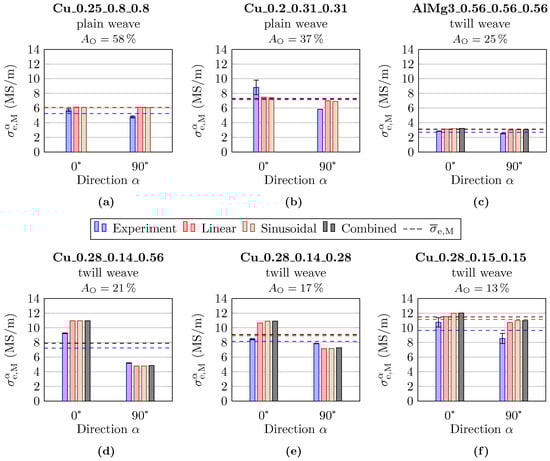 Comparison of the measured and analytically calculated specific electrical conductivity of the investigated meshes depending on the direction : (a) Cu_0.25_0.8_0.8, (b) Cu_0.2_0.31_0.31, (c) AlMg3_0.56_0.56_0.56, (d) Cu_0.28_0.14_0.56, (e) Cu_0.28_0.14_0.28 and (f) Cu_0.28_0.14_0.14.