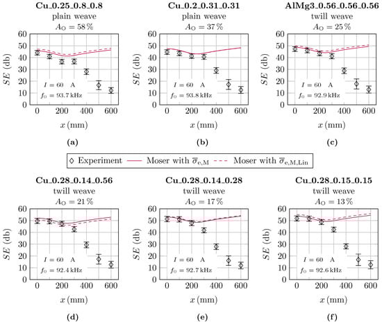 Figure 10 summarizes the results of the analytical calculation using the approach of Moser [16] and experimental determination of the shielding effectiveness . The SE of the investigated metal meshes is determined on the basis of both the experimentally determined mean value of the electrical conductivity and the analytically approximated mean value of the electrical conductivity using the proposed linear approximation approach.