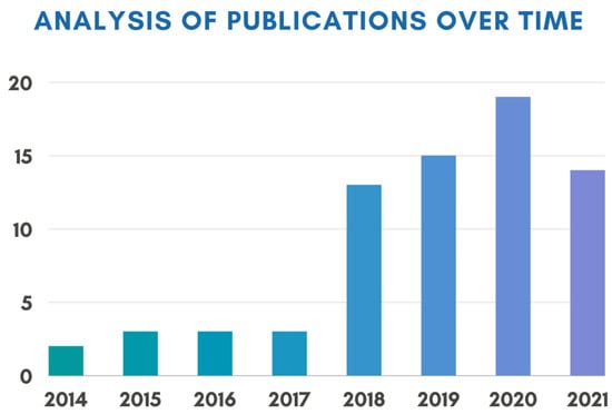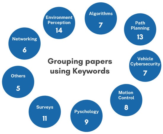(1) Year of Publication—we have analyzed the number of publications released yearly among the papers in our final database. Three papers from this were from 2014, the year we started collecting papers from 2015 and 2016 had three papers, and 2017 had four. Most of our database has papers from 2018, 2019, 2020, and 2021—thirteen, fifteen, nineteen, and fourteen, respectively. This analysis showed us that research on AVs has been happening for a long time and increasing each year. Figure 2 demonstrates the increase in research over the years. (2) Topic of Research—after grouping the papers according to different keywords, we learned the main focus areas in which research was the spearhead for AV technologies. We decided to choose five of the nine topics to review the current research and development in those topics. We chose Environment Perception, Pedestrian Detection, Path Planning, Vehicle Cybersecurity, Motion Control, and Psychology towards AV. Environment Perception and Pedestrian Detection are two separate topics because there was a lot of research focusing on just pedestrians and how the algorithms required in pedestrian detection are different from object detection. The other survey and review papers were used as a reference while writing this paper, and a comparison between the five review papers is also provided in the Introduction.