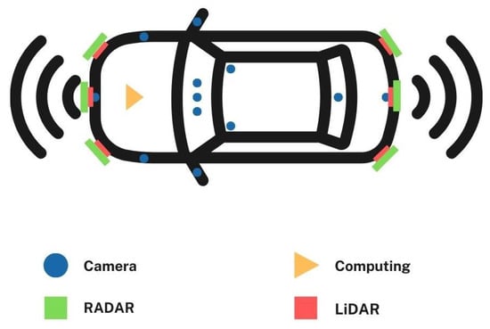 Cameras: Autonomous vehicles have visible light cameras to provide a 360-degree view of the surroundings. They are great at object detection and recognition, and this data is sent to the AI-based algorithms for further use. However, such cameras are inaccurate in dark conditions and generate a large amount of data to process. Infrared cameras are also used for better performance in conditions of low visibility. RADAR: It is a sensor that uses radio waves to calculate factors like distance, velocity, and angle. With the help of radar transmitters, AVs can emit radio waves and receive the reflected waves with the help of radar receivers. Radar operates well in most weathers and over long distances, but it may falsely identify objects []. LiDAR: A sensor that uses light as a medium to measure distances is calculated by measuring the time it takes for the light to get reflected in the receiver. Such systems emit laser beams that hit the environment and reflect to a photo-detector. The collected beams are converged together like a point cloud. This creates a 3D image of the environment. Although LiDAR is a powerful and efficient sensor, it is expensive. GNSS: It describes the layout and configuration of satellites, providing vital information such as navigation, positioning, and traffic. GNSS uses triangulation to detect the position of receivers and calculates the distance between satellites in the geostationary orbit and the vehicle. These signals, however, are weak and can be manipulated by interference. Ultrasonic sensors: They are short-range parking sensors and are pretty cheap. They have a limited range, but are ideal for low-speed situations. These sensors measure the distance of a target object by using ultrasonic waves, and the reflected signals are converted into electrical signals. GPS: It is a sensor that provides users with spatial information such as navigation, positioning, and timing. The service is free for civilians and is a vital aspect of path planning in autonomous vehicles. Figure 4 represents the positioning of different sensors on a vehicle.