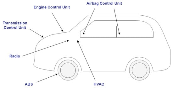 The automotive sector is going through a significant development trend regarding autonomous driving. Sensors, communication systems, actuators, etc., are some of the components becoming more and more common in vehicles due to this. This has led to more complexity, which has increased the number of ways cyber-attacks can occur []. This leads to attackers having access to the vehicles from outside. Several security-related projects have been conducted as a result of these concerns. Bold initiatives are being taken by technology giants, automobile manufacturers, and governments all over the world to build safer and more affordable AVs and bring them to market quickly. Cooperation is essential for tackling the issue of cybersecurity. Various publishers published a collection of cyber attacks []. Based on the different levels of details, these attacks were classified and presented by Florian Sommer et al. []. By categorizing attacks according to varying levels of fact, we can use the taxonomy for security testing and TARA to provide a uniform description for testers and security developers. The classification has a collection of 162 published security attacks, while another version has 413 multi-stage attacks on AVs. These are made available online to collect knowledge for further research on these topics. Remote control of an AV is another area where more research is required. When an autonomous vehicle is under attack, all the vehicle controlling operations need to be assigned to the driver []. This approach won’t be possible in a level 5 automation. The velocity and position are essential parameters to control a vehicle remotely. For this, a possible solution could be deploying IoT sensors in ITS [,]. If the data communications through wireless channels are under attack, the attack signals need to be isolated from all the decision-making processes. Once the attack signals are detected, the jammer could be set up to block attackers only, without interfering with communication. Figure 6 demonstrates the potential attack surfaces vulnerable in a cyber attack.