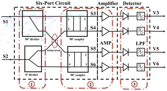 The rest of this paper is organized as follows. In Section 2, we describe the theory of the complex cross-correlation circuits, after which the influence of mismatch of the detection diode on the correlator is also analyzed to guide the analog correlator design. Section 3 presents the design and measurement of each part of the correlator, including the 0° and 90° divider chips, coupler and amplifier chip, and the detection circuit. In Section 4, the integrated six-port circuit using the designed chip is measured, after which the Sweep-frequency test is applied to the fabricated analog correlator. Finally, the conclusion is provided in Section 5.