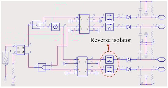 As shown in Figure 1, in the detection circuit, a low-pass filter (LPF) is connected behind the diode, which means that the RF signal will be reflected by the LPF. Therefore, the entire detection circuit in the wideband range is mismatched, and it is necessary to consider the influence of the mismatch of the detection circuit on the correlator. Assuming that each device in the six-port circuit is completely ideal, the reflected signal will be consumed by the isolation resistance or the internal resistance of the signal source, and it will not affect the correlation results. To evaluate the influence of the reflected signal on the correlation results, we assume that the isolation of each device in the six-port circuit is 20 dB, the return loss of each port is −20 dB, and the amplitude and phase consistency are ideal. Then the simulation of the influence of reflected signal on correlation results is carried out in Advanced Design System (ADS), which is represented in Figure 2.