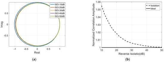Influence of mismatch of the detection circuit on correlation results: (a) The variation of the correlation circle with the reverse isolation; (b) The variation of the radius of the correlation circle with the reverse isolation.