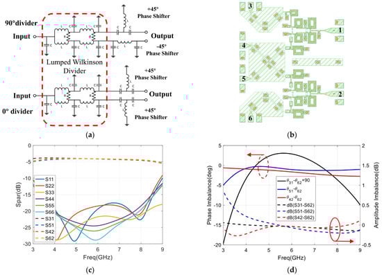 To reduce the area of the designed chip, the  and  divider adopts a lumped Wilkinson power divider, and the design focus is to ensure that the phase difference is  between the two output ports of the  divider in the operating frequency range of 4–8 GHz. Therefore, the  phase-shifting structure [] is applied at the output of the divider to meet the requirement of the divider. It is worth noting that two + phase-shifting structures are also applied at the output of the  divider to keep the consistency of phase and amplitude. Then the schematic, layout design, and simulation result of the designed integrated divider chip are shown in Figure 4.