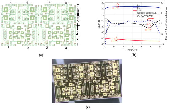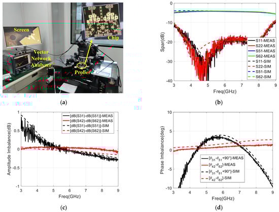 The measurement of the fabricated divider chip is carried out on the probe station, and the Keysight N5227B vector network analyzer is also used. It can be seen that the measurement results are consistent with the simulation results. From 4–8 GHz, the return loss () of the input port is better than −18 dB, and the insertion loss () of the  and  divider is better than −4.7 dB, with the in-band fluctuation less than 0.5 dB. From Figure 5c,d, the amplitude imbalance is less than  dB and the phase imbalance is less than .