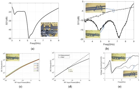 The measurement result of the detection circuit: (a) The measurement result of LPF; (b) The return loss of both types of detectors; (c) Measured DC output versus input power at different frequencies; (d) The square-law detection region of the detector; (e) The voltage sensitivity of the detector when the input power is −20 dBm.