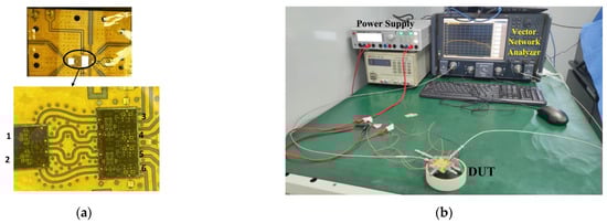 To evaluate the performance of the six-port circuit, a printed-circuit-board test fixture, which is designed using a 5-mil thickness Rogers 3003 substrate with 50 Ω microstrip, is taken for the measurement of the integrated six-port chip. The Keysight N5227B vector network analyzer and Rohde and Schwarz HMP 2030 programmable power supply are used for the measurement, which is represented in Figure 9.