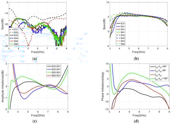 The port number of the six-port circuit is shown in Figure 9a. It can be seen that, within the working frequency band of 4–8 GHz, the return loss of each port is better than −14 dB and the average gain is about 5 dB, which is illustrated in Figure 10a,b. From Figure 10c,d, the measurement result of the amplitude imbalance of the six-port circuit is less than  dB, and the phase imbalance is less than .