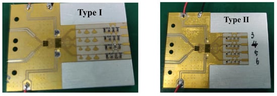 As shown in Figure 1, an analog correlator consists of a six-port circuit and four detection circuits, then the final correlator has been realized on a 5-mil thickness Rogers 3003 substrate, and the substrate is bonded to a metal carrier for fixing. In addition, two types of analog correlators have been designed for measurement, which is represented in Figure 11. The difference between the two types of correlators is the matching of the detectors, and the other circuits of the correlator are the same type I used 100-ohm and microwave stub for matching, and type II only used 100-ohm for matching. Considering that the amplifier plays the role of reverse isolation, the purpose of designing two types of correlators is to further investigate the influence of the matching state of the detector to the correlator. Moreover, the size of type I is 49 × 36 mm, and the size of type II is 39 × 36 mm.