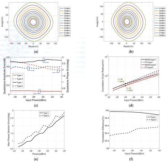 It can be seen that the correlation circle of the type II correlator is similar to an ellipse; and the correlation circle of the type I correlator is close to the ideal circle, which is reflected in the quadrature amplitude error of the correlator in Figure 13c. Moreover, from Figure 13d, there is a linear relationship between the correlation amplitude (dB). In addition, by fitting the amplitude curve of the correlator, when the input power is greater than −28 dBm the correlator is out of the square-law detection range, resulting in the correlation circle gradually becoming a diamond, which can be seen in Figure 13a,b. Therefore, the input power of the correlator is recommended to be less than −28 dBm. Then the input power (dB) and the average correlation amplitude of the type I correlator are about 25% larger than that of the type II correlator, while the input power is less than −28 dBm, which can be calculated from Figure 13d.