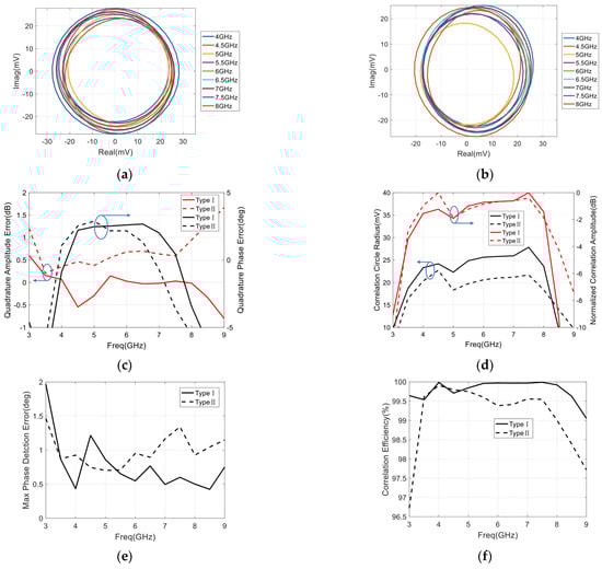 It can be seen that the quadrature amplitude error of the type I correlator is better than the type II correlator, and the correlation circle of the type II correlator is closer to the ellipse, which is consistent with the conclusion of the measurement in Section 4.2.1. In addition, in the frequency range of 4–8 GHz, the average correlation amplitude of the type I correlator is about 22% larger than that of the type II correlator, which is represented in Figure 14d, and the normalized correlation amplitude fluctuation of both types of correlators is less than 1.9 dB, which is also represented in Figure 14d. Meanwhile, by comparing with the correlator, which has been published [], the proposed correlator exhibits a more stable frequency-dependent property. As shown in Figure 14e, the maximum phase detection error of both types of correlators is less than 1.4° within the operating frequency range of 4–8 GHz, which meets the requirement of the interferometric imaging system. The calculated correlation efficiency of both types of correlators is greater than 99%, and the correlation efficiency of the type I correlator is larger than that of the type II correlator, which is shown in Figure 14f. From these measurements, we can see that the proposed analog correlator could be used to implement correlation measurements, and its amplitude flatness satisfies the requirements of the imaging system.