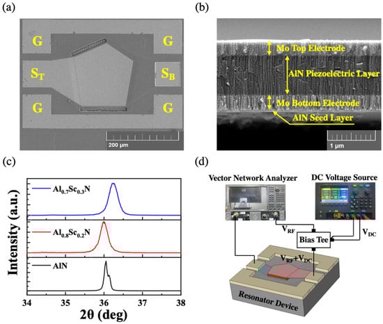 Figure 1. Characterization and experimental measurement of FBARs. (a) Morphology of the designed resonator; (b) Cross-sectional view of the AlN-based FBAR; (c) X-ray diffraction (XRD) results of AlN, Al0.8Sc0.2N and Al0.7Sc0.3N piezoelectric thin films; (d) Schematic of the measurement setup.