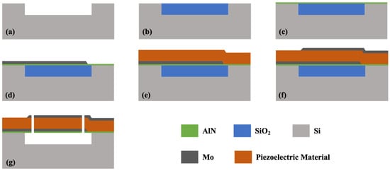 Figure 2. Schematic of process flow. (a) Si substrate with a cavity; (b) Cavity filled with SiO2; (c) AlN seed layer deposition; (d) Mo bottom electrode deposition and patterning; (e) Piezoelectric material sputter-deposition; (f) Mo top electrode deposition and patterning; (g) Releasing cavity.