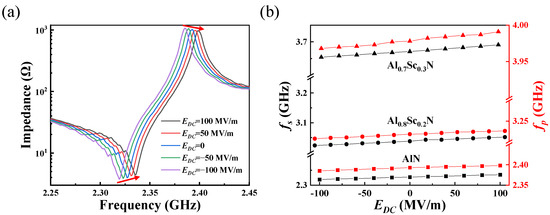 Figure 3. Resonant characteristics of FBAR under different EDC. (a) Measured impedance curve versus frequency at various EDC of AlN-based FBAR. (b) fs and fp as a function of EDC of AlN, Al0.8Sc0.2N and Al0.7Sc0.3N-based FBARs.