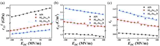 Figure 5. The extracted values of equivalent piezoelectric parameters with different EDC. (a) Stiffness coefficient c33; (b) Piezoelectric coefficient e33; (c) Relative dielectric constant εr.