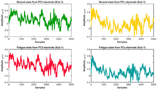 In contrast to previous studies, we also considered the sound of the car engine when recording the EEG signal. It was necessary to consider all parameters of the driving environment to navigate the present study to the practice field. For each topic, the driving task began at 9:00 a.m. Each day, just one EEG signal was captured to verify that the recording time was consistent. The raw EEG signal obtained from the two electrodes, FC3 and FCZ, related to two states of fatigue and normal, is illustrated in Figure 2. According to Figure 2, the visual distinction between fatigue and normal stages is difficult. It depended on the experience and expertise of the expert, which indicated the need to design automatic detection of driver fatigue systems based on EEG signals.