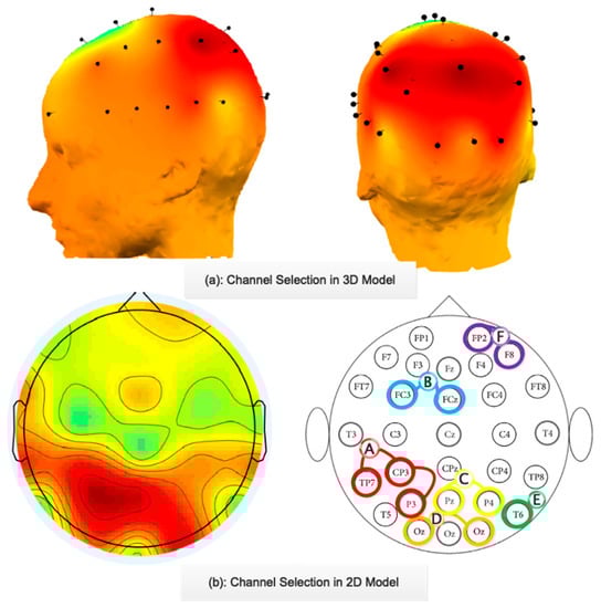 Select active channels in 2D and 3D models (region A = TP7, CP3 and P3; region B = FC3 and FCz; region C = Pz and P4; region D = O1 and O2; region E = T6; region F = FP2 and F8).