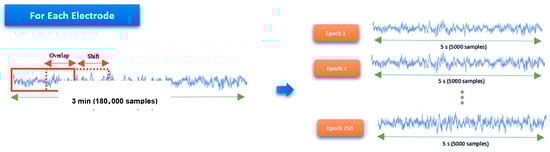 As illustrated in Figure 4, six areas of the brain (A, B, C, D, E, and F) were employed for the automated identification of driver fatigue; consequently, the simulation used just those six regions (A, B, C, D, E, and F). According to Figure 4, the distribution of selected electrodes was not dispersed, as previously demonstrated in previous studies. A detailed interpretation of the selected regions can be found in [48], which shows that the EEG bursts were uniform when driving in the central and posterior regions. In addition, from the point of view of the EEG signal frequency analysis, it can be stated that theta and gamma rhythms increased with increasing fatigue, particularly in the central and forehead areas, and beta rhythms increased with decreasing consciousness in the posterior regions. Fifth, the suggested technique selected three minutes of the recorded signal for normal and fatigue phases for every channel. In such a scenario, we possessed two classes of data (180,000 dimensions) for every channel. Then, with the overlap method to avoid over-fitting, the data in each channel were divided into 5-second intervals. Accordingly, every electrode was separated into 250 samples based on the size of the shift, so we had , where is the number of electrodes. Since there were 11 subjects and two classes (normal and fatigue) in this study, the final dimension of the network input matrix would be equal . Figure 5 shows overlap operation.