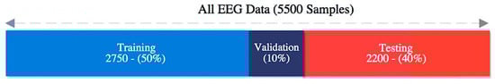 The suggested network architecture utilized a cross-library in the Python programming language to combine seven convolutional 1D layers and three LSTM layers. The fusion of the LSTM network with the CNN network increased stability and reduced oscillation. The details of the proposed deep network architecture for region E are offered in Table 1 and Figure 6. The dimensionality decrease in the hidden layers progressed from 5000 (the number of starting features) to 100, as shown in Table 1 and Figure 6 (selected feature vector). Ultimately, to compute scores, the chosen feature vector was connected to an FC layer using the SoftMax activation function. The stride length in the first layer of the proposed network was considered different for various regions. As can be seen, a large-sized filter was considered in the first layer of the proposed network, which helped to overcome high-frequency noises. Filters with small sizes were also used in the next layers of the proposed network, which would result in a better representation of input data. It should be mentioned that the values for hyper-parameters were adjusted, relying on a study of relevant investigations and tests performed on them. Finally, the Cross-entropy loss function and Adam optimizer [49] with a learning rate of 0.001 were selected for the training process. The total number of parameters for region E was 102,878. The total number of samples for each region was 5500; 2750 samples (50%) were randomly selected for network training, 550 samples (10%) were used for validation, and 2200 samples (40%) were used for testing. EEG data distribution for training, validation, and testing is depicted in Figure 7.