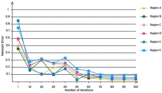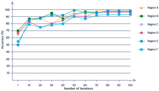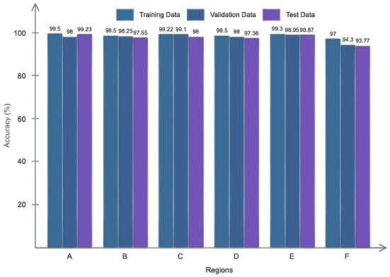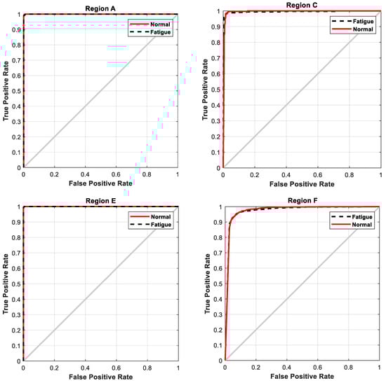 The system specifications used included 8 GB of RAM and a 2.4 GHz CPU. Figure 8 shows the proposed network error for all regions for validation data. As illustrated in Figure 8, the network error for all areas decreased as the number of iterations increased and achieved a steady-state value around the 75th iteration. Figure 9 indicates the suggested method’s accuracy for all areas of validation data. In accordance with this figure, the suggested technique for two-stage categorization of driver fatigue had an accuracy of 99.23%, 97.55%, 98.00%, 97.36%, 98.78%, and 93.77% after approximately 75 iterations for areas A, B, C, and D. The confusion matrix for the two-stage categorization of all areas for testing data is shown in Figure 10 to allow for a more detailed analysis of the suggested technique. As can be seen, the accuracy achieved by the proposed method for region E was promising. In addition, as shown in Figure 10, as can be seen from the confusion matrix for the single-channel region (E), out of 1093 samples, only 17 samples were incorrectly detected, demonstrating the adequate performance of the suggested network architecture. It may be utilized to develop an autonomous driver fatigue detection system to achieve a high execution rate. In addition, Figure 11 depicts a bar chart depiction of accuracy in the training, validation, and testing processes for all areas. Figure 12 illustrates the receiver operating characteristic (ROC) curve analysis of the suggested approach for evaluating data from areas A, C, E, and F. According to Figure 12, the curved position was in the left hemisphere for all regions.