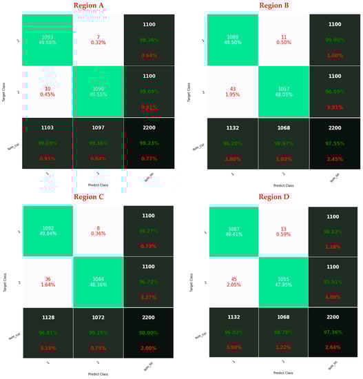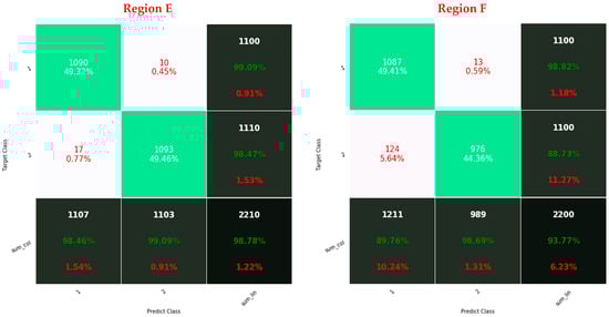 The confusion matrix for two-stage classification for regions A, B, C, D, E, and F.