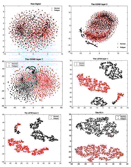 Visualization of convolutional, long short-term memory, and fully connected layers in the proposed deep network for a sample of normal and fatigue states.