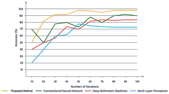 According to the same table, as we can see, deep networks such as CNN–LSTM, CNN, and DBM showed better results depending on feature learning from raw signals compared to feature learning from manual features. As a result, we inferred that deep learning networks do not need a previous understanding of the issue/theme. However, according to Table 4, based on feature learning with manual features, the CNN–LSTM, CNN, and DBM networks showed a relatively similar performance. Figure 14 compares the suggested CNN–LSTM network to the comparable networks in terms of accuracy in applying feature learning from primary data in 100 iterations. According to this figure, the proposed network had a high convergence speed, low oscillation (due to the presence of the LSTM network), and high classification accuracy compared to the comparable networks. The time required for the training and testing of the proposed CNN–LSTM and similar networks is shown in Table 5 for all active regions. Table 5 shows that the suggested network’s training time was greater than the alternatives. The test time for the proposed network was also acceptable compared to other networks. However, there was no need to worry because, with the advent of new graphics processing units (GPUs) and their use for processing, the learning time problem for deep learning networks was completely resolved. The minimum time required for training and testing is related to the MLP network. Still, as shown in Table 5 and Figure 14 above, the classification accuracy according to that network was not within acceptable limits.