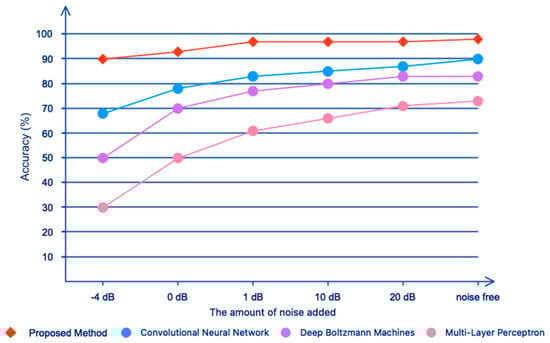 Environmental circumstances do not remain constant when driving; thus, the suggested approach must be evaluated in ambient sounds such as vehicle engine noise and driver behavior while driving to determine assumptions that are more realistic. White Gaussian noise was introduced to the testing data with varying SNR levels to assess the performance of the various techniques (i.e., suggested approach, CNN, DBM, and MLP) in the existence of environmental noises (−4 to 20 dB). The test accuracy of the proposed method, CNN, DBM, and MLP networks based on feature learning for each SNR is shown in Figure 15. As can be seen, the proposed method, CNN, DBM, and MLP were robust to environmental noise, respectively, up to SNR ≤ 0 dB, SNR ≤ 1, SNR ≤ 10, and SNR ≤ 20, such that their accuracies were still approximately 90%, 80%, 80%, and 70%. As a result, it may be claimed that the suggested technique, outperforming CNN, DBM, and MLP, was also more resistant to environmental noise. The amazing architecture of the proposed network in the first layer of a large-sized filter was used to overcome high-frequency noises. Based on the available evidence, it can be stated that the proposed method could also be used for noisy data.